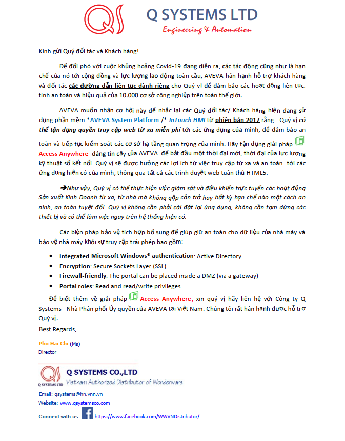 Q Systems xin kính báo tới các Quý vị Đối tác và Khách hàng hiện đang sử dụng Aveva Systems Platform/InTouch HMI từ phiên bản 2017 nên tận dụng phần mềm điều khiển giám sát từ xa - Access Anywhere để hoạt động sản xuất được liên tục.