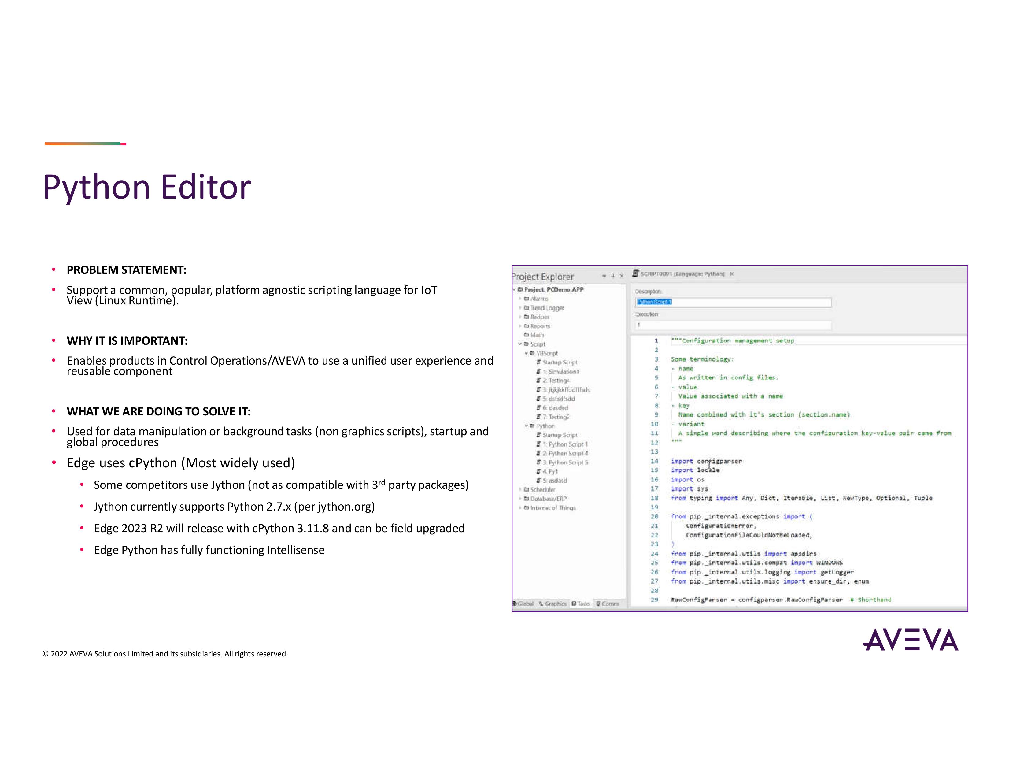 Có rất nhiều tính năng mới về Python trong EDGE. Cài đặt CPython trong những phiên bản 3.11.8 được sử dụng rộng rãi và phổ biến nhất, khá mới và ổn định. Tuy nhiên, một lưu ý quan trọng là cài đặt có thể được nâng cấp trực tiếp không cần phải gỡ cài đặt hoàn toàn hay quá nhiều thao tác phức tạp. Trình soạn thảo Python của chúng tôi cũng có tính năng Intellisense hoạt động đầy đủ, không giống như một số Phần mềm khác trên thị trường. AVEVA đã triển khai Python trong các nhóm tập lệnh nền, tập lệnh khởi động cũng như các thủ tục toàn cục, để người dùng có thể tạo các hàm Python hoặc hàm tập lệnh của riêng mình.
