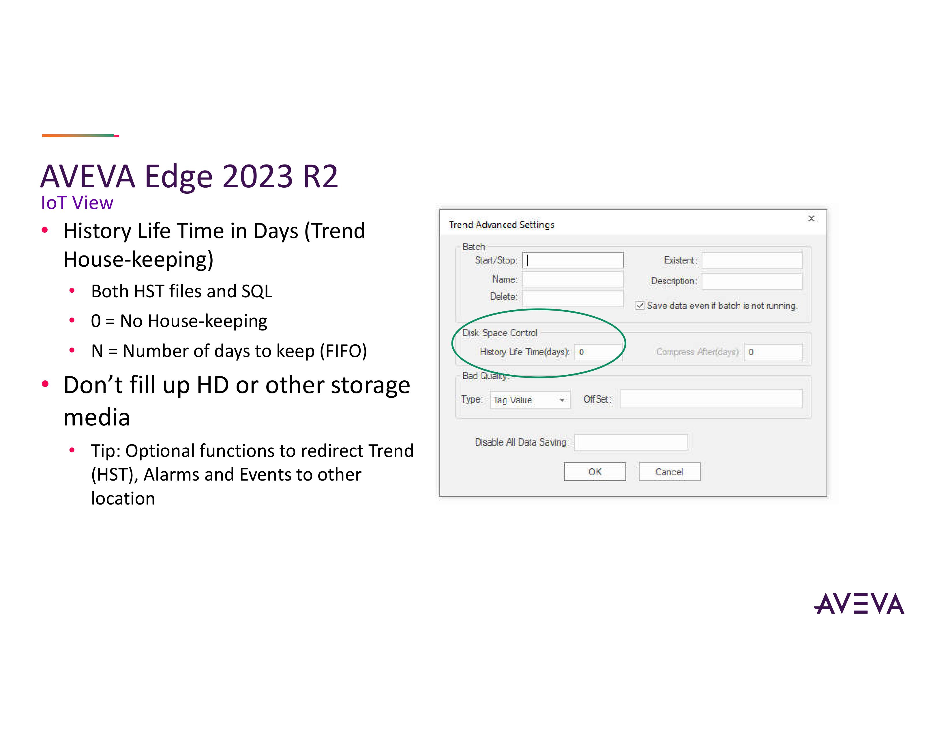 AVEVA đã thêm tính năng lịch sử thời gian hoạt động (tính bằng ngày) về cơ bản thực hiện việc dọn dẹp, bảo trì không gian lưu trữ dữ liệu, nhờ đó ổ cứng của bạn sẽ không bị đầy. Điều này rất quan trọng.
