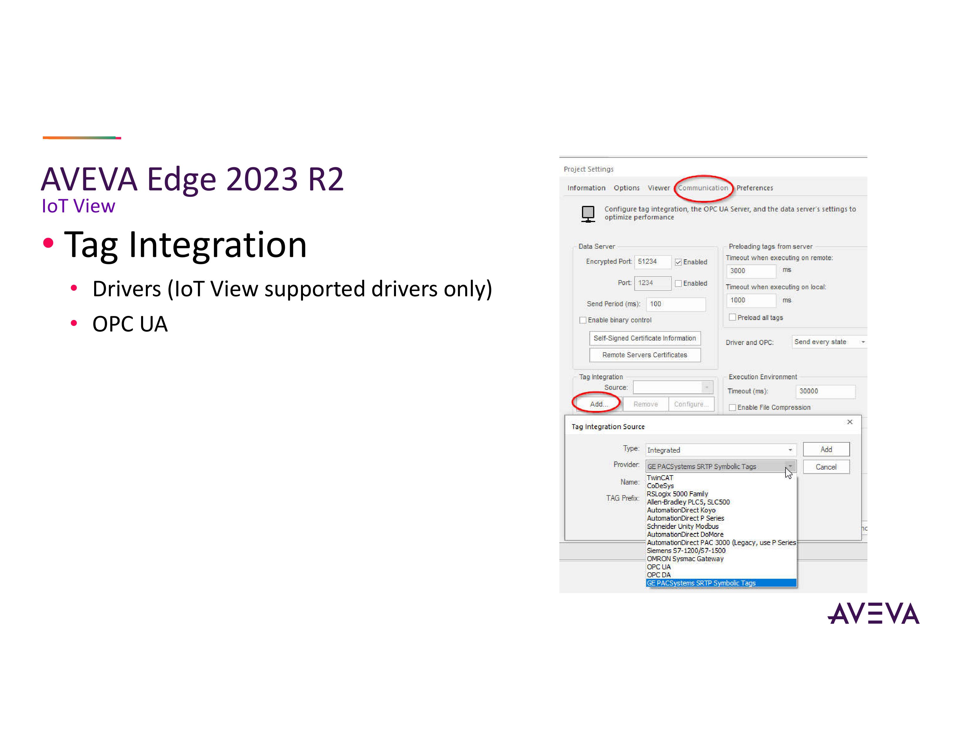 Ngoài ra, AVEVA đã thêm tính năng tích hợp tag cho các trình điều khiển IoT View drivers Hãng không thêm drivers mới và cũng không thêm tính năng tích hợp tag đến những phần của hệ thống trước đây chưa được hỗ trợ tính năng này. Điều nàygiúp người dùng không cần lo lắng về việc học các trình điều khiển hoàn toàn mới hay một hệ thống tích hợp thẻ thay đổi quá cơ bản ở những nơi chưa từng có. Update này là các trình drivers đã hỗ trợ tích hợp tag và các trình drivers đã được IoT View hỗ trợ. Giờ đây AVEVA hỗ trợ tính năng tích hợp tag cho IoT View. Ngoài các trình điều khiển, Phần mềm cũng đã thêm tính năng tích hợp tag cho OPC UA. Thêm đó là cập nhật một số trình drivers độc lập và cung cấp chúng mà không phụ thuộc vào bản phát hành.