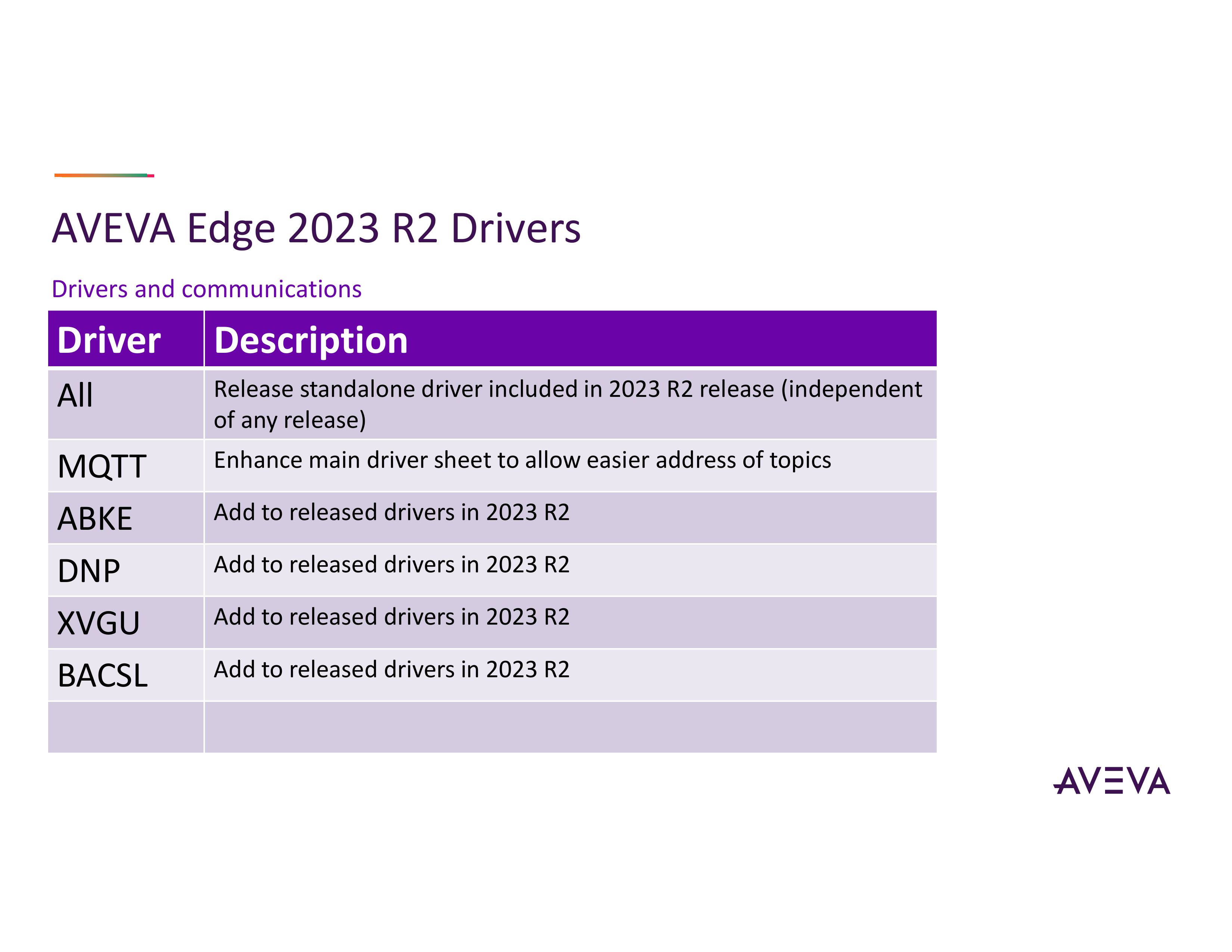 Edge 2023 R2 được cho phép trình điều khiển MQTT dễ dàng truy cập chủ đề hơn và cập nhật trình điều khiển ABKE, trình điều khiển DNP3, XVGU (là đèn tín hiệu tháp của Schneider) vàthêm các trình điều khiển BACnet SL.